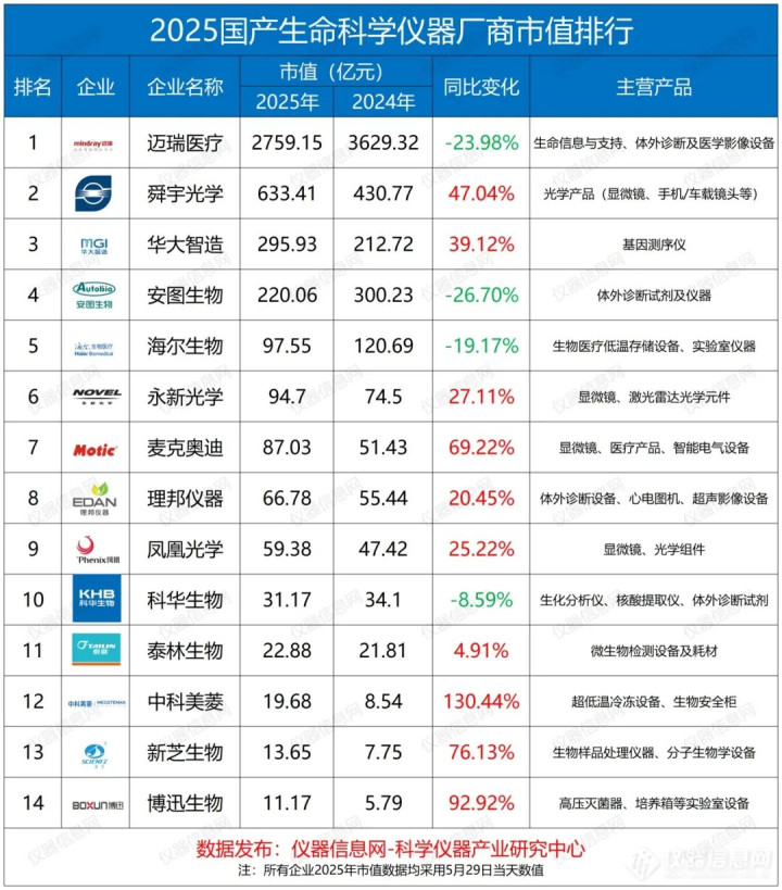 近期,仪器信息网统计了国产生命科学仪器主要14家上市厂商的2025年市值情况。市值排行前5是迈瑞医疗、舜宇光学、华大智造、安图生物和海尔生物。对比2024年市值,共有10家厂商实现增长,中科美菱以+130.44%的增速居于首位;4家厂商市值下降,安图生物(-26.70%)下降最为明显。详情如下:
