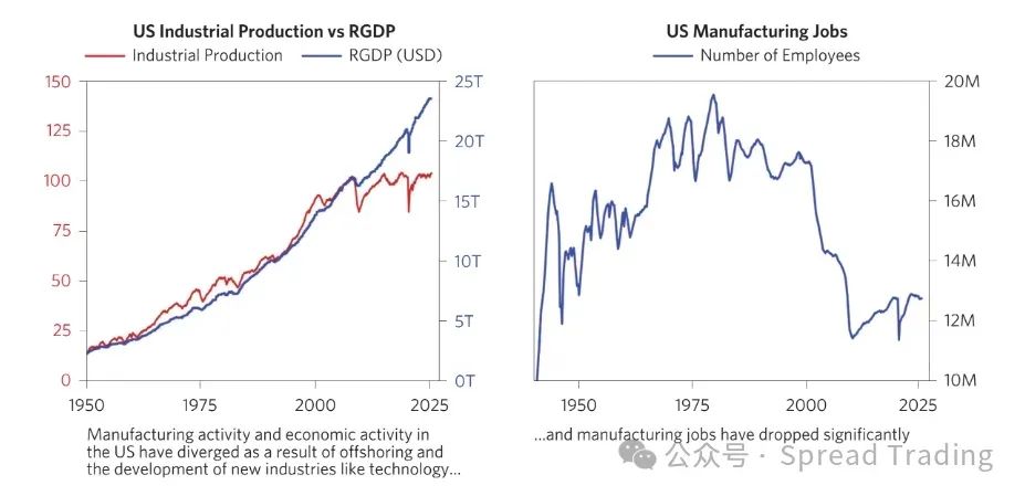 在过去数十年全球化影响下,美国经济与产业体系已实现高度“优化”:国内留下最高附加值的服务业,并将大部分生产制造环节外包至效率更高的地方,这种长期趋势造成了今日美国制造业面临多重结构性问题: