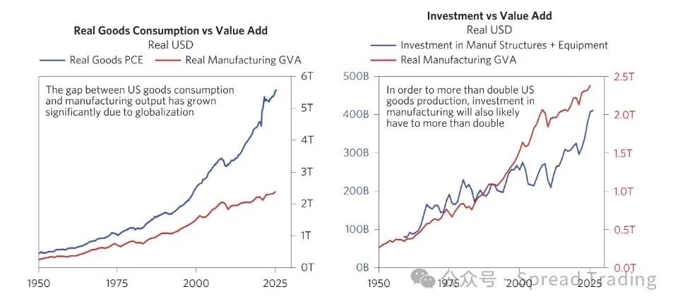 根据桥水的估算,商品消费价值与美国制造业的产出之间存在约3万亿美元的差距,要弥合这一差距,需要将目前每年不到5千亿美元的制造业投资翻倍至1万亿美元。