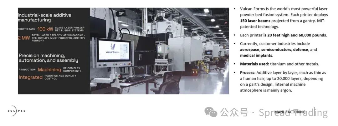例如,位于波士顿的Vulcan公司,其激光粉末床熔融系统配备了150个激光光束,能够以极高的精度逐层(每层薄如发丝)制造钛金属等零件,其客户涵盖航天、国防和医疗等领域。