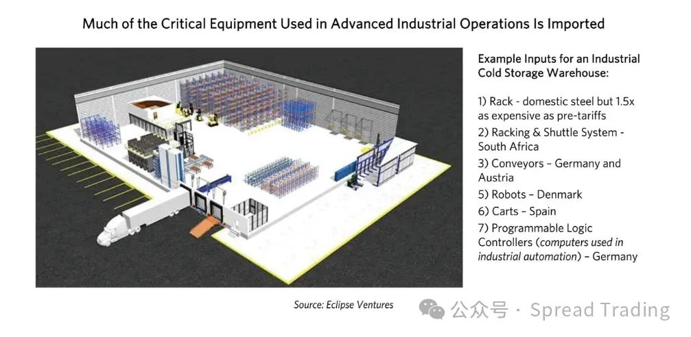一个鲜明的案例是,一个工业冷藏仓库的建置:其所需的货架与穿梭系统来自南非,输送带来自德国和奥地利,机器人来自丹麦,而PLC则来自德国——只有钢架是由国内制造,但相比征收关税前贵了1.5倍。