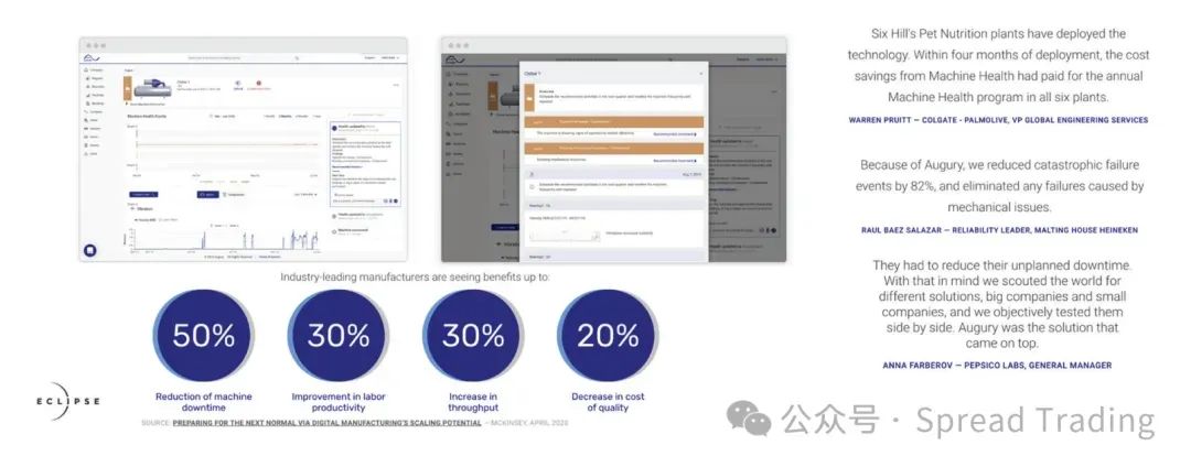 例如,Augury公司提供的服务,其客户反馈的灾难性故障事件减少82%,劳动生产力提升30%,产出也增加30%。