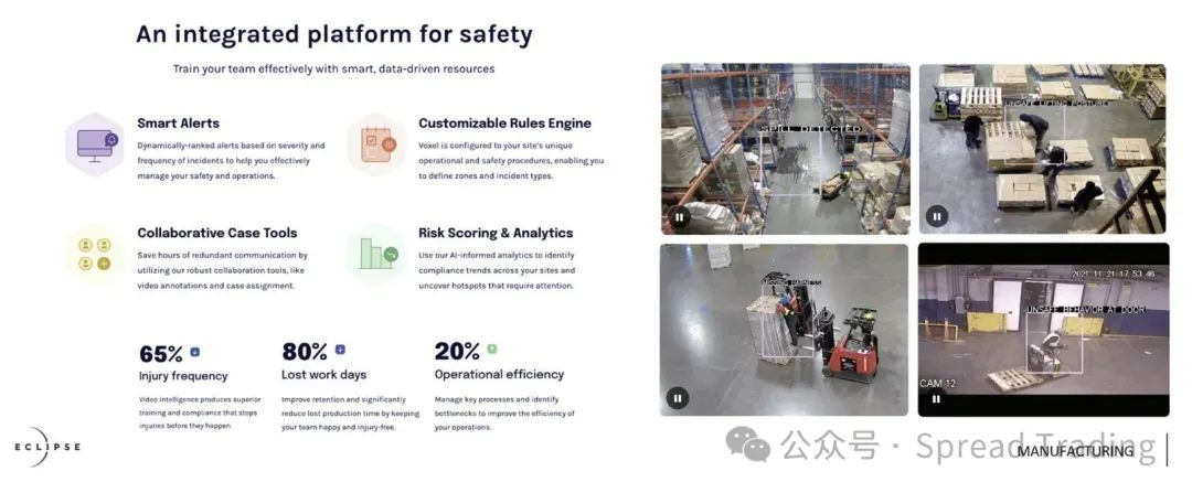 例如,下面展示的一个计算机视觉用于提高工业环境安全性的例子。事实证明,此类系统的存在(向地面操作员提供管理反馈回路)可将事故减少60-80%,并将运营效率提高约20%。