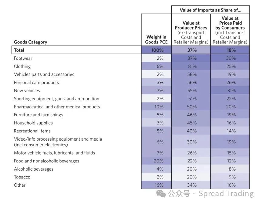 其中高度依赖的行业:鞋类和服装等类别中,美国几乎完全依赖外国生产,进口分别占消费的87%和81%。对于这些劳动力成本占比较大的商品而言,由于缺乏可行的国内竞争,关税几乎肯定会直接转嫁给消费者。
